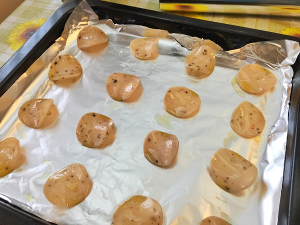 也可以一点油不放,直接摆在烤盘里烤,锡纸也不用垫因为没有油。但是口感要比有油的差一点哦。