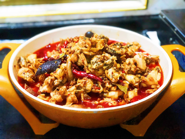 最后在煮好的田鸡上淋上干辣椒爆香的油