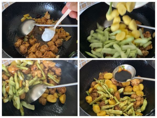 豆角炒断生 淋入3汤勺生抽。翻炒均匀。