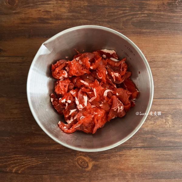 沥干的牛肉中加入盐+胡椒粉+料酒+老抽抓至粘手