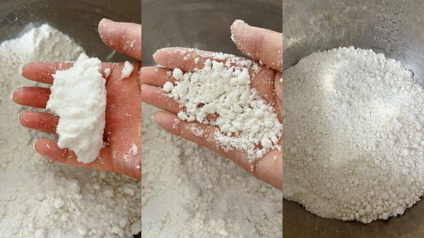 然后用手搓成粉状,最后可以攥成团,轻捏一下又可以散开即可。