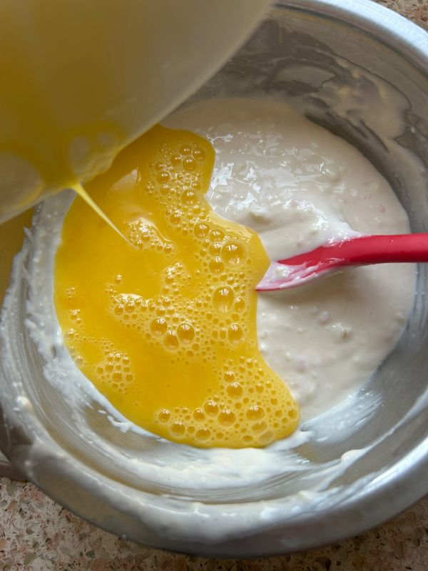 两个全蛋液加入5g白砂糖混合均匀,倒入奶酪冰淇淋糊中拌匀