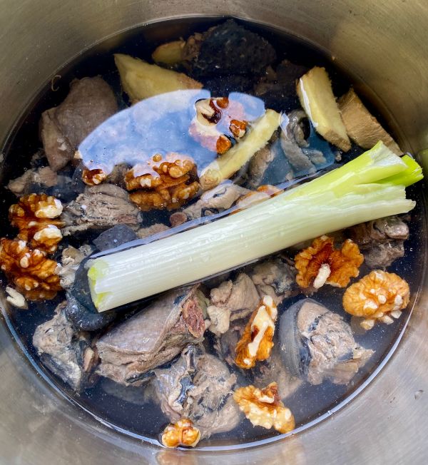 洗净的乌鸡加入葱段姜片,加入核桃仁高压锅上气后转小火炖煮10分钟